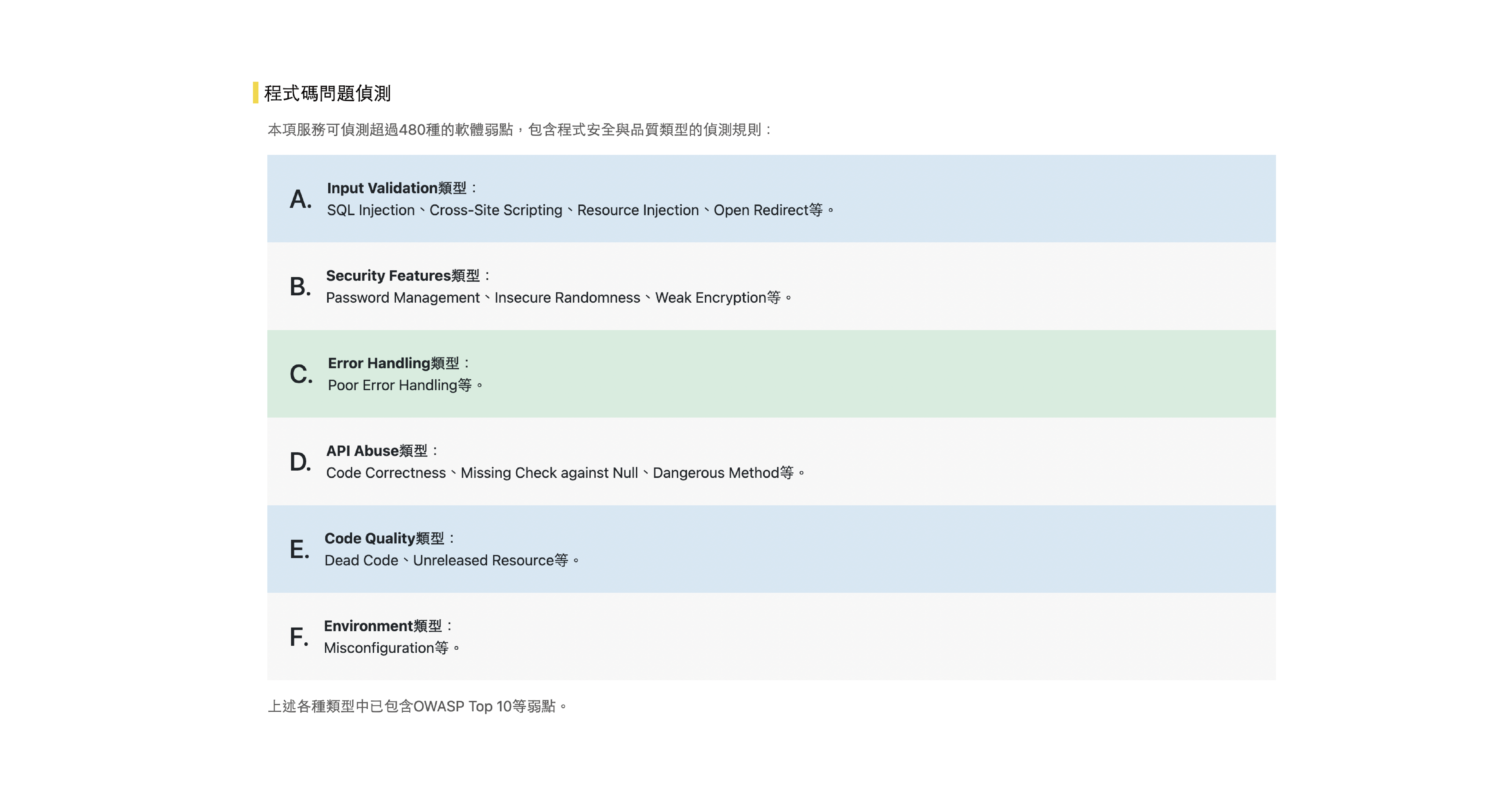 客製化修補建議 源碼檢測可依不同程式語言提供具體修補方案,專業團隊詳細說明每個弱點的錯誤樣態與對應程式碼範例,兼顧安全與實務可行性,協助快速修復